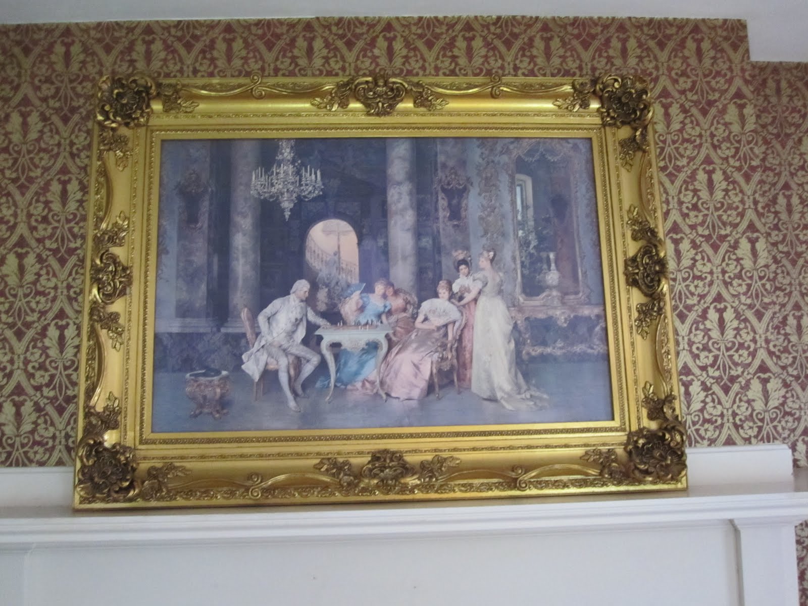 I think this is my personal favorite. The picture doesn’t do it justice, but the gold pattern is kind of shimmery. The room that it covers is HUGE, there are two guys working in there. I guess she was going for kind of a renaissance theme because check out the painting that she has over the mantel.