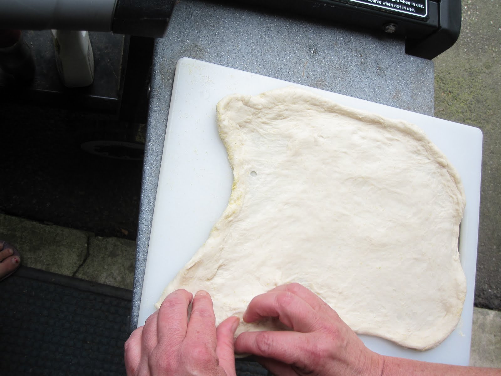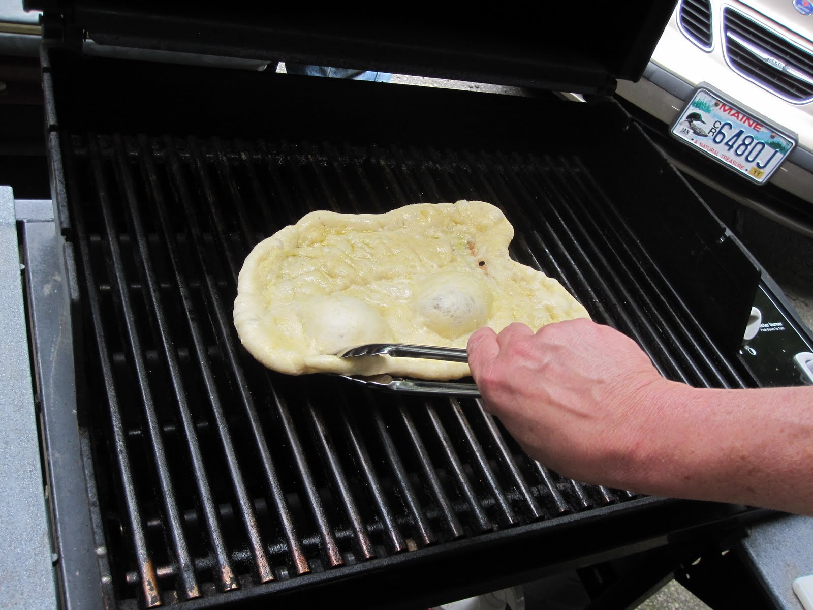 4. Next is the “part that sucks”, says mom.  You have to get the dough onto the grill. Mom just picks it up and flings it on there. She’s a bad ass and kind of a cooking ninja. Good luck with this.
