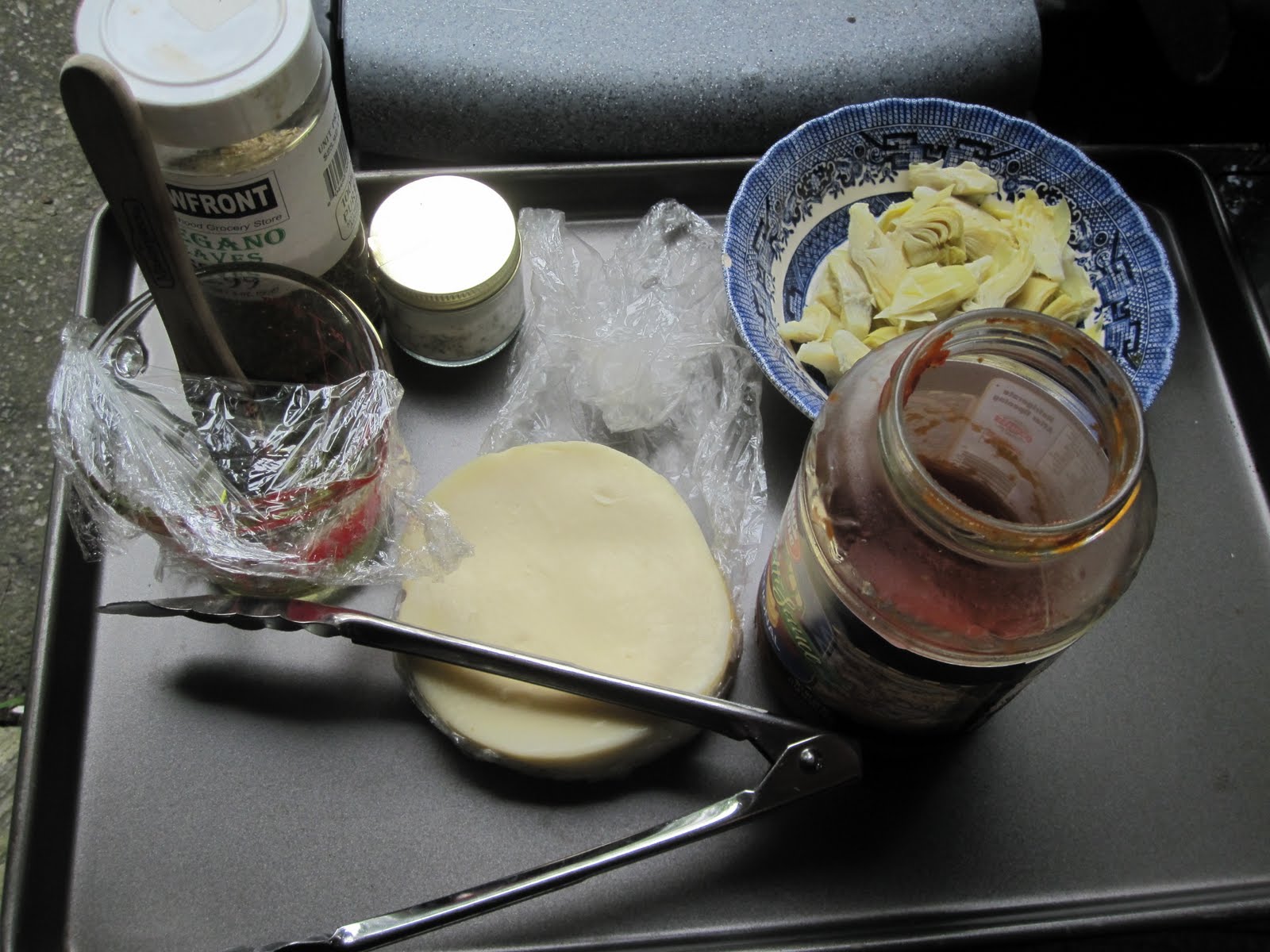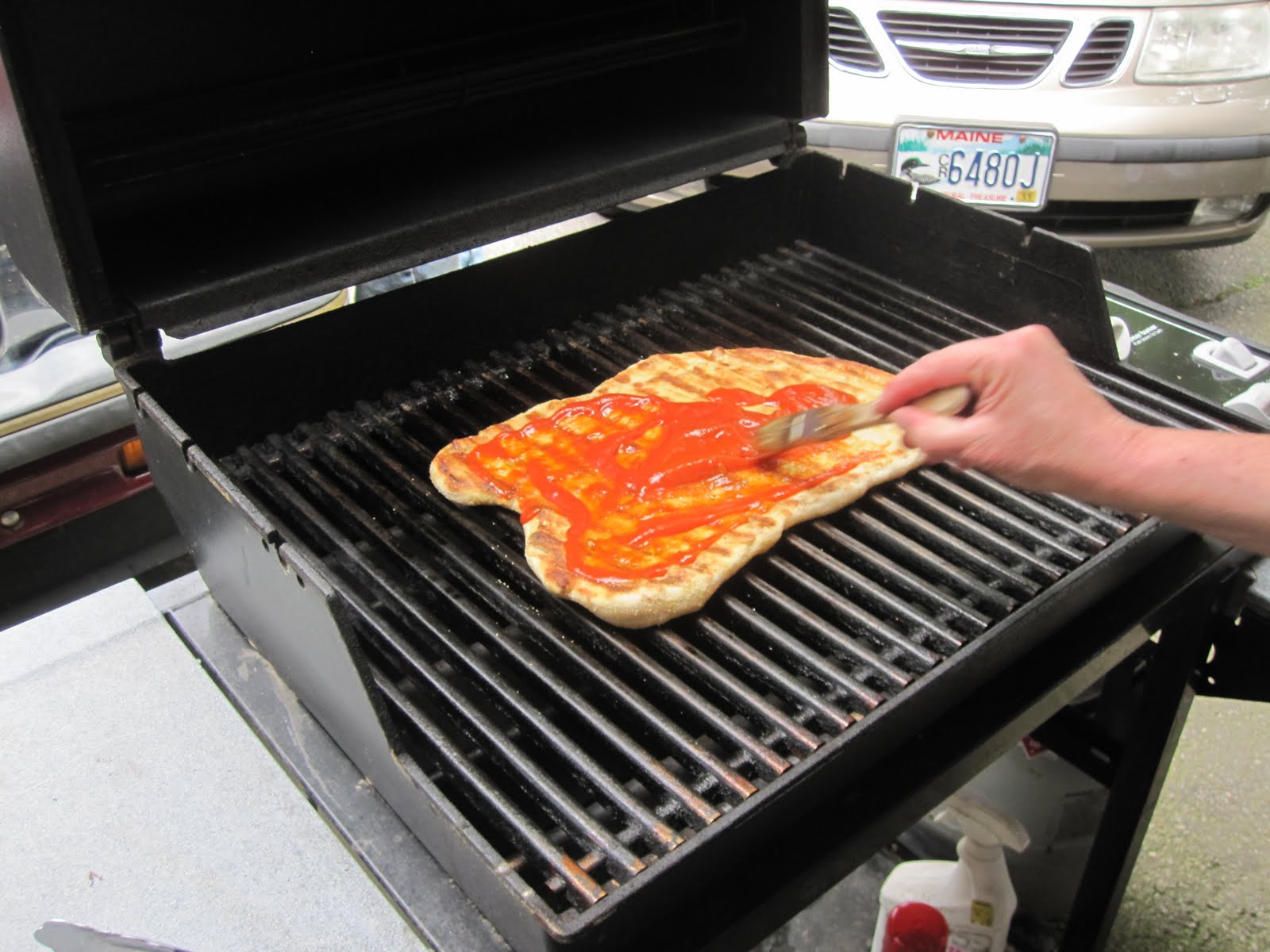 1. Get your shit together. Mom says this is KEY. (I think this pertains to life in general, so does my mom, however right now we’re talking about your pizza supplies.) See how she has everything  there on the pan: sauce, cheese, spices, tongs, oil and pastry brush. Once you get this thing on the grill you do NOT want to have to keep running back into the house.
